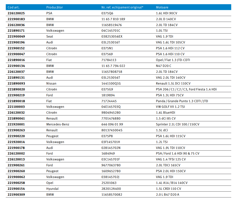 - Spectru larg de produse, constând în turbocompresoare de înaltă calitate pentru multe tipuri comune de motoare pentru autoturisme/autoutilitare și alte aplicații