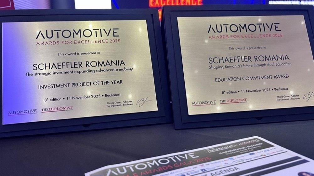 Schaeffler România a primit două recunoașteri importante - „Investiția Anului” și „Angajament în Educație” - în cadrul Automotive Industry Forum & Awards for Excellence 2025, desfășurat în 11 noiembrie la București. Evenimentul, organizat de The Diplomat și Automotive Today, a reunit liderii industriei auto pentru a dezbate direcțiile strategice, inovațiile tehnologice și provocările unei piețe aflate într-o transformare rapidă, marcând totodată performanțele companiilor și proiectelor care modelează viitorul mobilității.