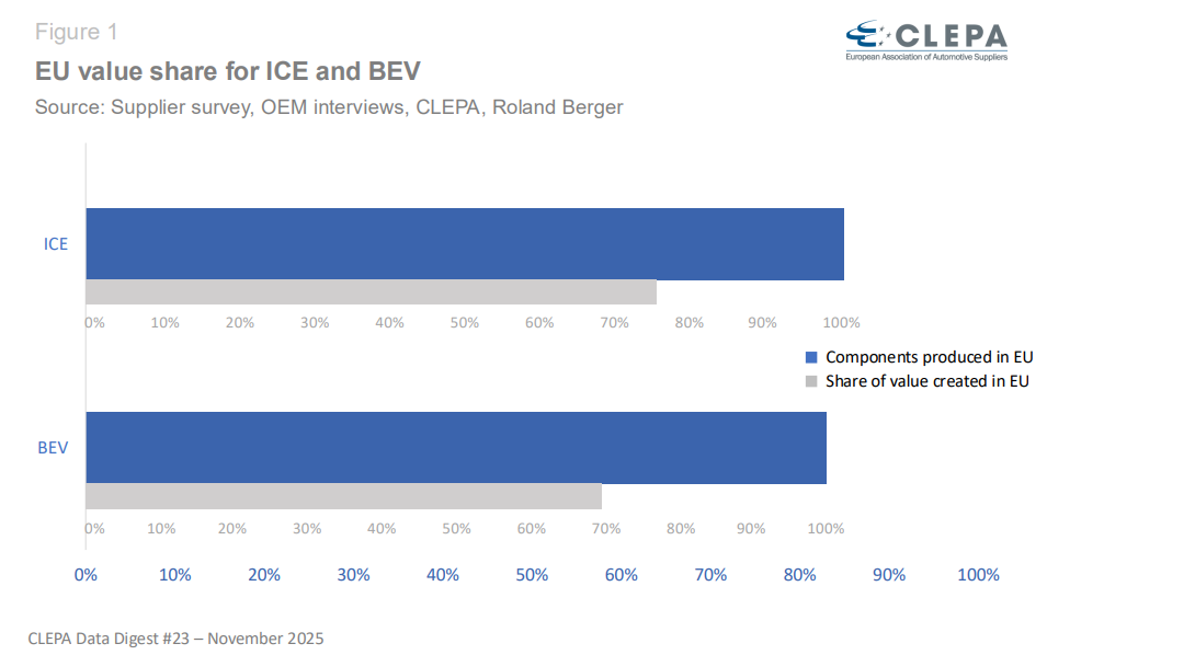 Majoritatea componentelor pentru vehiculele cu motor de ardere asamblate în Europa continuă să fie achiziționate local. Aproximativ 85% din piese sunt produse în UE, iar 76% din valoarea lor totală este creată în regiune. Pentru vehiculele electrice cu motorină (BEV), aprovizionarea internă rămâne comparabilă, la 83%, dar ponderea valorii create în Europa este mai mică, în medie de 70% (fără baterii), deoarece lanțul valoric mai larg se bazează încă pe contribuții din alte regiuni.