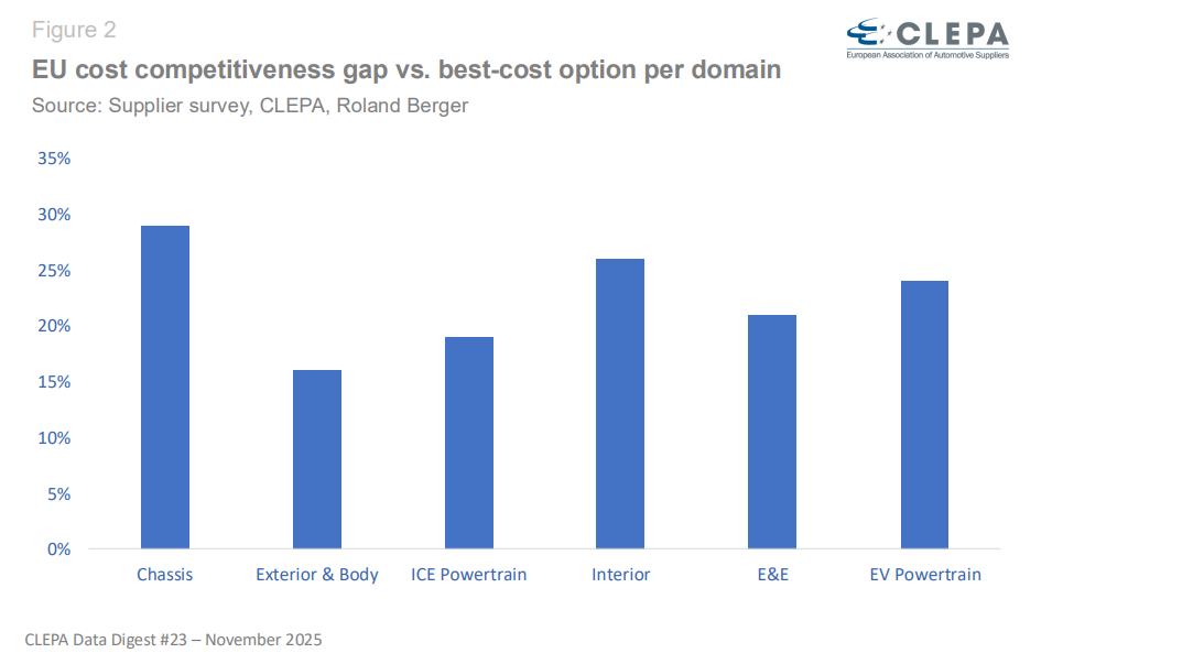 Europa se confruntă în prezent cu un dezavantaj de costuri de până la 35% în comparație cu alte regiuni, determinat de creșterea costurilor materialelor, energiei și forței de muncă, împreună cu regimuri de reglementare și emisii de carbon mai stricte. Dacă nu se rezolvă acest lucru, crearea de valoare în domeniul pieselor auto cu 23% și ar putea pune în pericol 350.000 de locuri de muncă până în 2030.