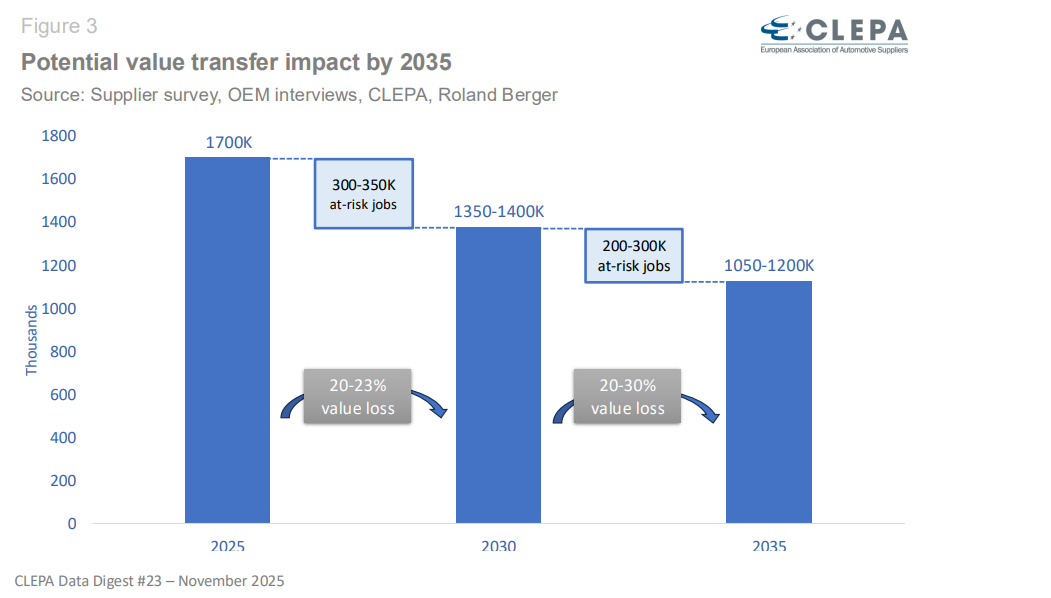 Dacă tendințele actuale continuă, crearea de valoare europeană în domeniul pieselor auto ar putea fi redusă cu până la 23% până în 2030. Această scădere reflectă atât volume de producție mai mici, cât și o valoare redusă per componentă, pe măsură ce mixul de sisteme de propulsie se schimbă, iar valoarea se mută în străinătate. Impactul asupra ocupării forței de muncă este semnificativ: până la 350.000 de locuri de muncă ar putea fi în pericol până în 2030.