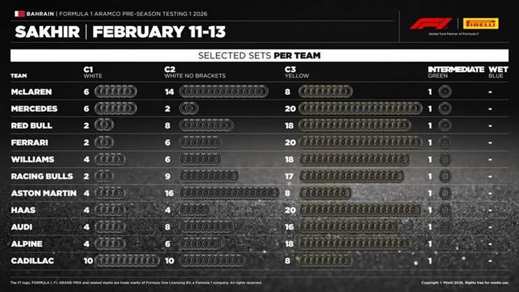 În cele trei zile ale primului test de pre-sezon, echipele pot folosi doar compozițiile slick C1, C2 și C3. Acestea pot utiliza până la 28 de seturi de pneuri pentru pistă uscată, iar un set de pneuri intermediare Cinturato va fi, de asemenea, la dispoziția lor.
